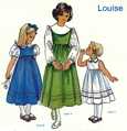 Louise is a high-waisted jumper or sundress. It is buttoned in the back and tucked at the hemline. A blouse pattern with two collar and two sleeve patterns is included. The sundress has a small round collar. The length is to below the knee.